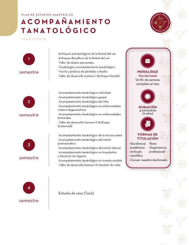 La maestría en Acompañamiento Tanatológico busca formar maestros de grado, competentes en el diagnóstico, diseño, aplicación, evaluación y seguimiento de programas de acompañamiento tanatológico que permitan el restablecimiento del equilibrio mental y emocional de las personas que viven o han vivido de manera directa o indirecta la experiencia existencial de una pérdida, de un duelo o de procesos relacionados con la finitud del ser.